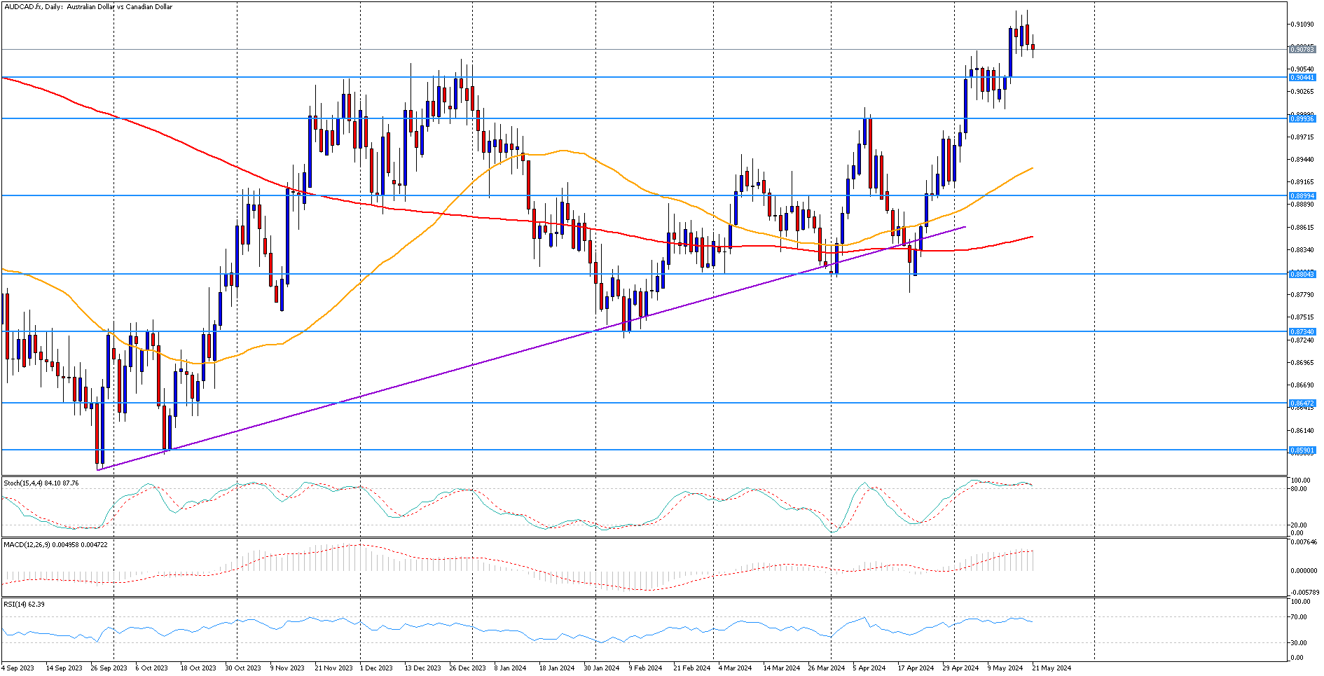 AUD/CAD se od začátku února pohybuje směrem vzhůru a na začátku dne dosáhl 14měsíčního maxima 0,9125. Vstup do oblasti 0,9100 byl v posledních dvou dnech obtížný a kolem několikaměsíčního maxima se může objevit další těžká překážka, ale podle technických ukazatelů by býci tento boj ještě nemuseli vzdát. Konkrétně ukazatel RSI stojí mírně pod úrovní 70 a ukazatel MACD rozšiřuje pozitivní momentum nad svou spouštěcí a nulovou linií, což obojí prozatím udržuje pozitivní tendenci. V případě, že pár znovu aktivuje svůj rostoucí trend nad dnešním vrcholem, bude dalším cílem bariéra 0,9230, která se bere z březnového maxima 2023. Na straně poklesu je první hladinou podpory, kterou je třeba mít na paměti na úrovni 0,9030. Proto by krok pod tuto linii na úrovni 0,9005, která se překrývá s 20denním jednoduchým klouzavým průměrem (SMA), mohl vyvolat novou negativní volatilitu.