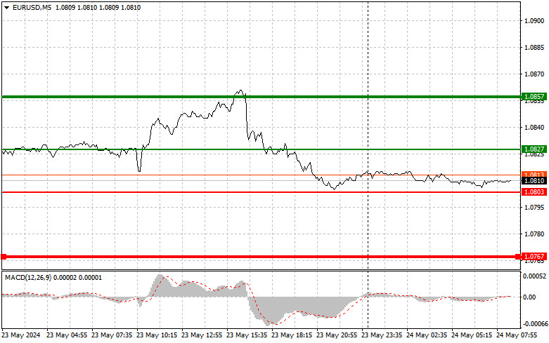 K otestování ceny 1,0835 došlo v době, kdy se ukazatel MACD právě začal pohybovat směrem dolů od nuly, což potvrdilo vstupní bod k prodeji eura. V důsledku toho se měnový pár EUR/USD propadl o více než 30 pipsů a dosáhl cílové úrovně 1,0806. Nakonec jsem však na konci dne po odrazu od této úrovně nenakupoval. Silné údaje o PMI ve zpracovatelském průmyslu a službách v USA vedly na konci týdne k výraznému výprodeji EUR/USD a zvýšily tlak na euro. Dnes může situace působit v neprospěch kupujících, zejména pokud se údaje o HDP Německa ukážou jako slabé. Zpomalení hospodářského růstu negativně ovlivní chuť obchodníků nakupovat euro i na současných minimech, takže s dlouhými pozicemi buďte velmi opatrní. Pokud jde o intradenní strategii, budu se spoléhat spíše na realizaci scénářů č. 1 a 2.