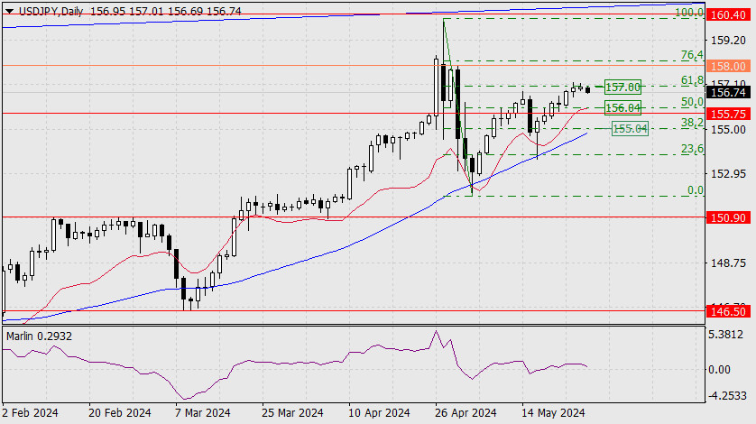 Pár USD/JPY nás překvapil svým neutuchajícím růstem. K růstu došlo na pozadí velkých objemů (nejvyšších v dubnu), zdaleka se však nejednalo o letošní rekordní objemy. Cena pravděpodobně prudce vzrostla, protože byly aktivovány příkazy stop-loss pro krátké pozice umístěné nad úrovní 155,55. Cena dosáhla horní hranice globálního cenového kanálu na úrovni 160,45. A je pravděpodobné, že se pár nad touto úrovní udrží. -