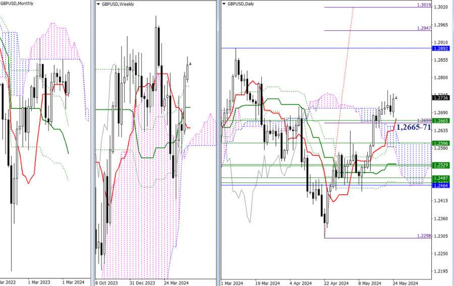 S blížícím se koncem května převládá na trhu aktuálně nejistota, přičemž hranice jsou vymezeny clustery úrovní z různých časových intervalů: 1,0885–71–59 a 1,0817–08–1,0796–92. Pokud dnes pár EUR/USD vykáže výraznou aktivitu a někdo se na konci měsíce rozhodne pohnout, mohly by do hry vstoupit vzdálenější úrovně, například poslední úroveň týdenního mrtvého kříže Ichimoku (1,0934) nebo spodní hranice denního cloudu (1,0722). -