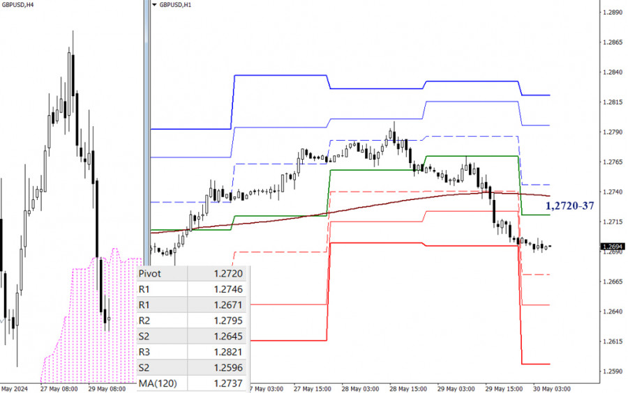 Intradenní pullback, který se vytvořil v úterý, byl včera potvrzen. Medvědi, kteří na situaci pracují, se vrátili do oblasti supportu (1,0817–1,0792) a sestoupili k důležitým úrovním supportu v čele s měsíčním krátkodobým trendem (1,0795). Možné proražení a spolehlivá konsolidace pod touto hranicí, kromě přesunu měsíčního krátkodobého trendu na stranu medvědů, povede ke konsolidaci v medvědím teritoriu vzhledem k týdennímu cloudu. To výrazně posílí medvědí tendenci a otevře nové vyhlídky.