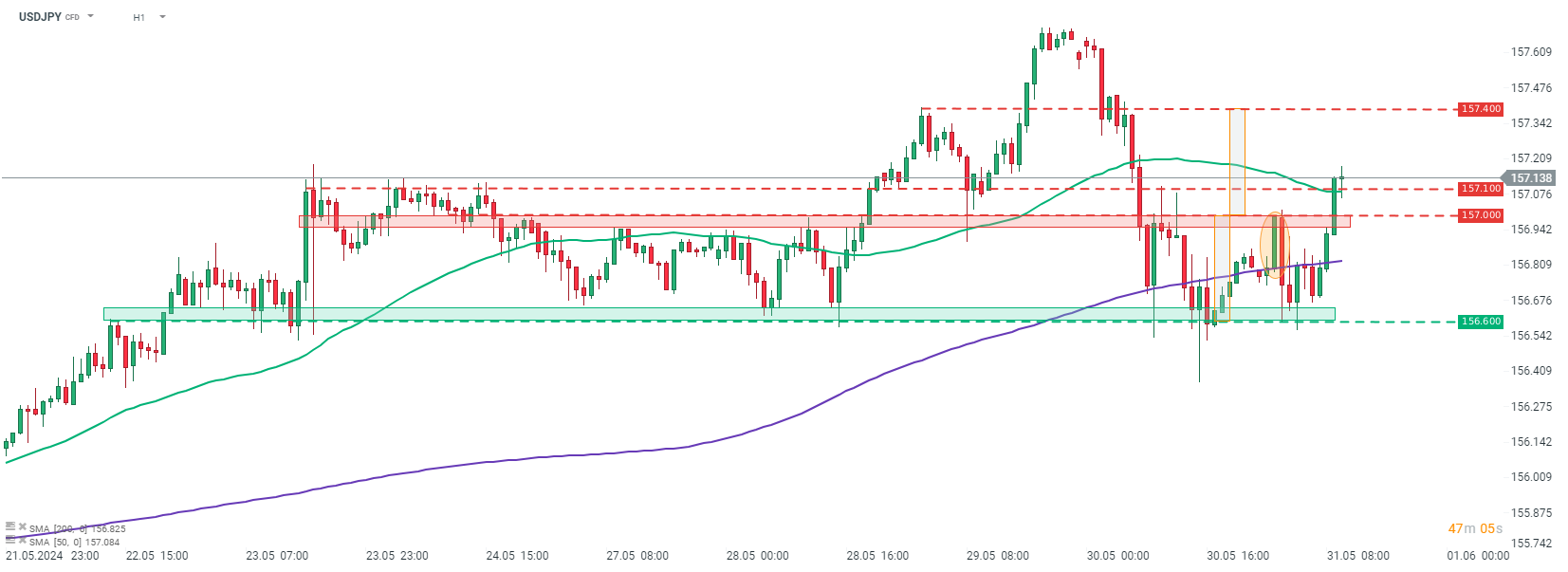 Když se podíváme na graf USDJPY v intervalu H1, vidíme, že pár po zveřejnění japonských údajů vyskočil (oranžový kruh), ale nepodařilo se mu překonat horní hranici krátkodobého rozpětí v oblasti 157,00. V brzkých hodinách evropského obchodování však došlo k dalšímu pokusu o proražení nad tuto oblast a tentokrát byl úspěšný. Pár také prorazil nad 50hodinový klouzavý průměr v oblasti 157,10. Učebnicový cíl proražení tohoto pásma směrem vzhůru naznačuje možnost pohybu k zóně 157,40.