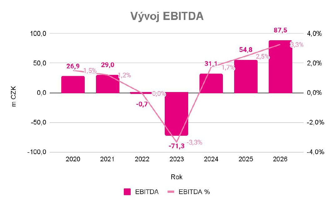 Společnost před týdnem reportovala výsledky za rok 2023, kdy tržby klesly o 13 % na 2,1 mld. Kč a společnost dosáhla ztráty na úrovni EBITDA 71,3 mil. Kč a ztráty 176 mil. Kč na úrovni čistého zisku. Čistý dluh společnosti meziročně vzrostl ze 154,8 na 171,1 mil. Kč.