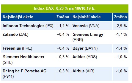 Ačkoliv se dnes v úvodu německý akciový trh pohyboval v negativních hodnotách, udržel si růstový trend a zakončil se ziskem 0,54 %. Nejvíce připisovala společnost Zalando (+3,0 %), Porsche (+1,7 %) a Brenntag (+1,6 %). V červených číslech zakončily tituly Rheinmetall (-2,0 %), Covestro (-0,6 %) a Henkel (-0,3 %). Celoevropský index STOXX Europe 600 připsal 0,64 %. Ze sektorů se nevíce dařilo realitám (+1,06 %), zbytné spotřebě (+1,0 %) a financím (+0,7 %). Jediným sektorem v záporu byla běžná spotřeba (-0,17 %). Index DAX +0,54 % na 18421,69 b. -