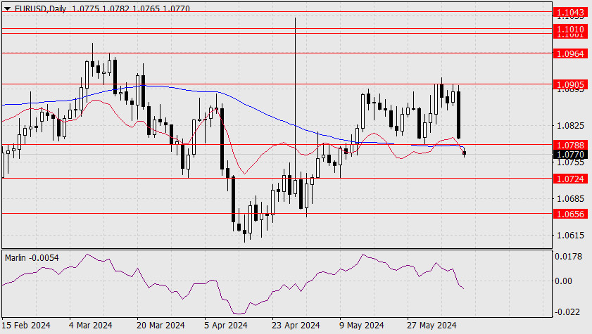 Nezaměstnanost v USA v květnu vzrostla z 3,9 % na 4,0 %, když míra účasti pracovní síly klesla z 62,7 % na 62,5 %, v sektorech mimo zemědělství přibylo 272 tis. nových pracovních míst oproti prognóze 182 tis. a hodinová mzda vzrostla o 0,4 %. Zlato kleslo o 3,45 %, měď o 4,94 %, ropa Brent o -0,54 %, pšenice o -1,92 %, index S&P 500 o -0,11 %, výnos pětiletých amerických státních dluhopisů vyskočil z 4,29 % na 4,46 %, euro ztratilo 0,78 % své hodnoty. Takový "tektonický" posun směrem k dolaru nelze chápat jinak než jako opožděnou reakci na snížení sazeb Evropské centrální banky. I objem obchodů byl ve srovnání se čtvrtkem znatelně vyšší.