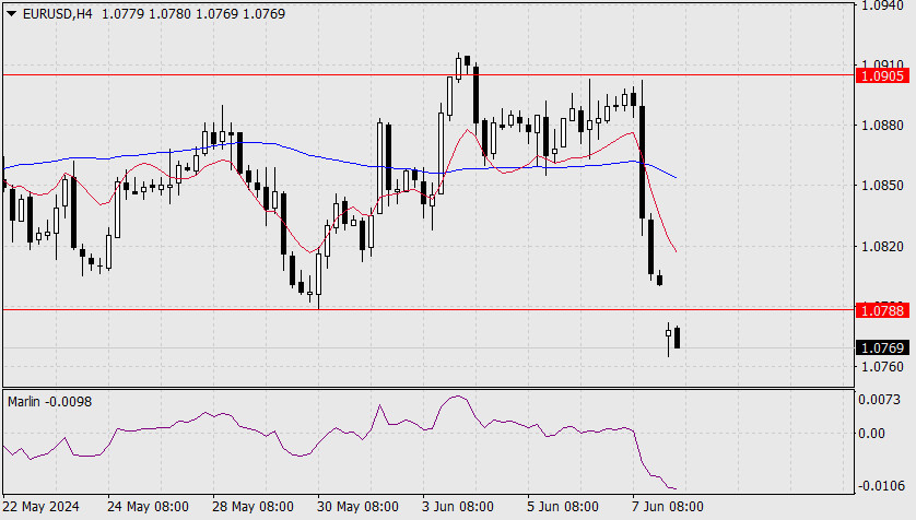 Ve 4hodinovém grafu oscilátor Marlin buď vstoupil do přeprodané oblasti, nebo se k ní blíží. Otevírací gap činí 25 pipsů. Čekáme, až trh tento gap uzavře, tedy až euro zahájí korekci, načež očekáváme, že cena konsoliduje pod úrovní 1,0788 a klesne k 1,0724.