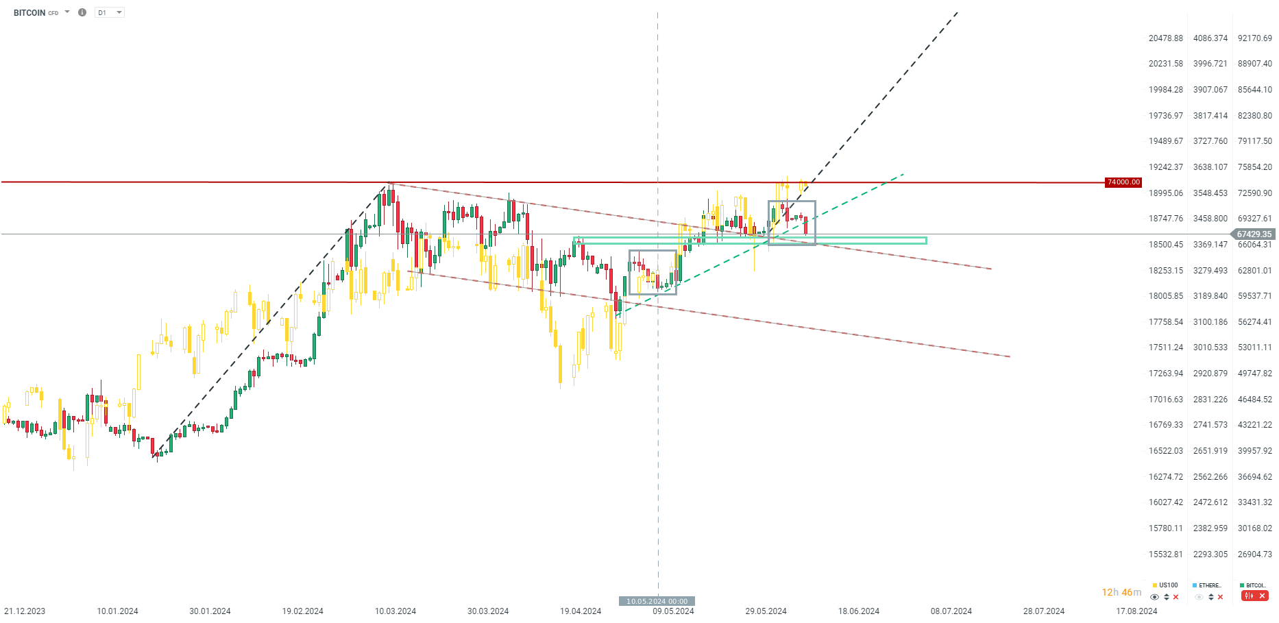 Bitcoin dnes klesl o více než 3 %, což představuje největší pokles od 10. května. Dnešní pokles může souviset také se včerejším odlivem prostředků z ETF, který je prvním odlivem od 9. května. Stojí za zmínku, že se jednalo také o lokální cenové minimum, od kterého došlo k jasnému odrazu a cena se vrátila nad 70 000 USD.