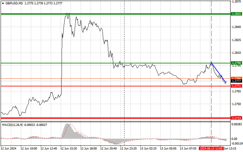 Test cenové hladiny 1,2798 se shodoval s dobou, kdy byl indikátor MACD značnou dobu v pásmu překoupení, a jelikož se kupcům libry nepodařilo dostat se nad denní maximum, bylo rozhodnuto o prodeji páru GBP/USD. V důsledku toho se pár propadl o zhruba 20 bodů. Nedostatek statistických údajů ze Spojeného království ovlivnil růstový potenciál páru. Odpoledne se očekává mnoho údajů o americké ekonomice. Směr trhu určí index cen výrobců bez cen potravin a energií, počet prvních žádostí o podporu v nezaměstnanosti a počet opakovaných žádostí o podporu v nezaměstnanosti. Jestliže budou údaje z USA lepší, než ekonomové předpovídali, může se tlak na britskou libru rychle vrátit. Pokud jde o intradenní strategii, plánuji jednat na základě realizace scénářů č. 1 a č. 2.