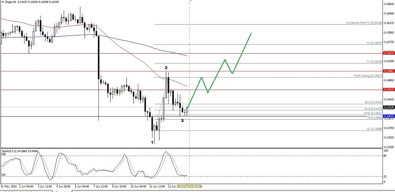 Ve 4hodinovém grafu kryptoměny doge se sice 50 EMA nachází pod 200 EMA, což značí, že ve 4hodinovém grafu stále dominují prodávající, avšak vytvoření býčí formace 123 dává tušit, že v blízké budoucnosti, dokud kryptoměna doge neklesne, oslabí pod hladinu 0,13688. Kryptoměna má potenciál k posílení a růstu na úroveň 0,14635. Pokud tuto úroveň úspěšně překoná, pak bude dalším cílem úroveň 0,15061. I když ho podpoří dynamika a volatilita, není vyloučeno, že hladina 0,15474 bude dalším cílem, ke kterému se pokusí zamířit.