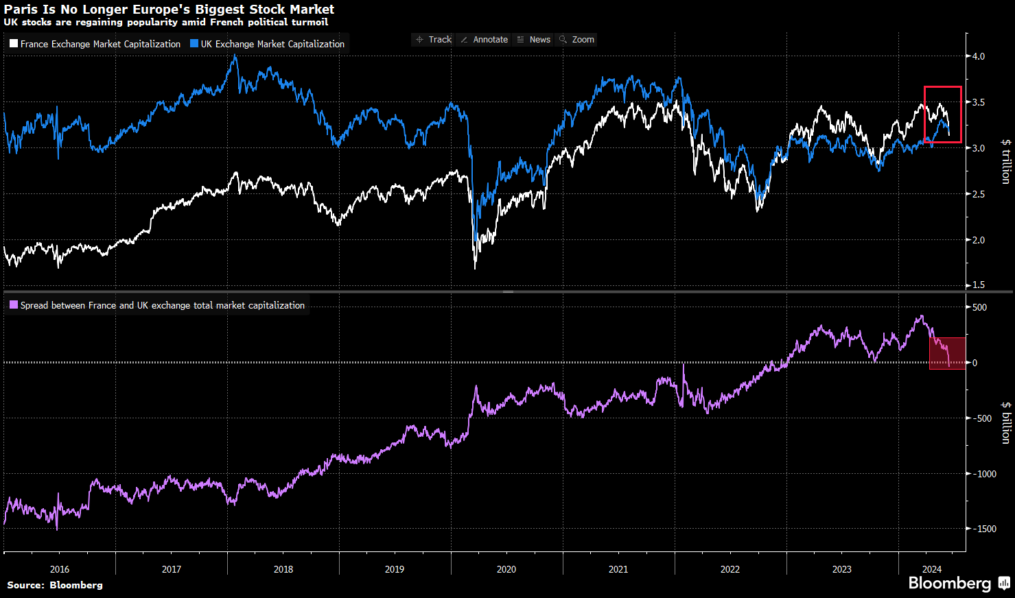 Francie se před blížícími se parlamentními volbami otřásá jak politicky, tak ekonomicky. Volby předčasně vypsal prezident Emmanuel Macron v reakci na eurovolební fiasko své vlastní partaje. První kolo voleb proběhne už 30. června. Přitom v nich Macronovu partaj může přeskočit jak strana Marine Le Penové, tak aliance levicových stran. Ve Francii tak poprvé od let 1997 až 2002 může nastat takzvaná kohabitace, tedy situace, kdy je prezident z jiné politické strany než premiér, resp. parlamentní většina. Což je z hlediska správy země v poloprezidentském systému, jakým Francie je, pochopitelně méně efektivní varianta.