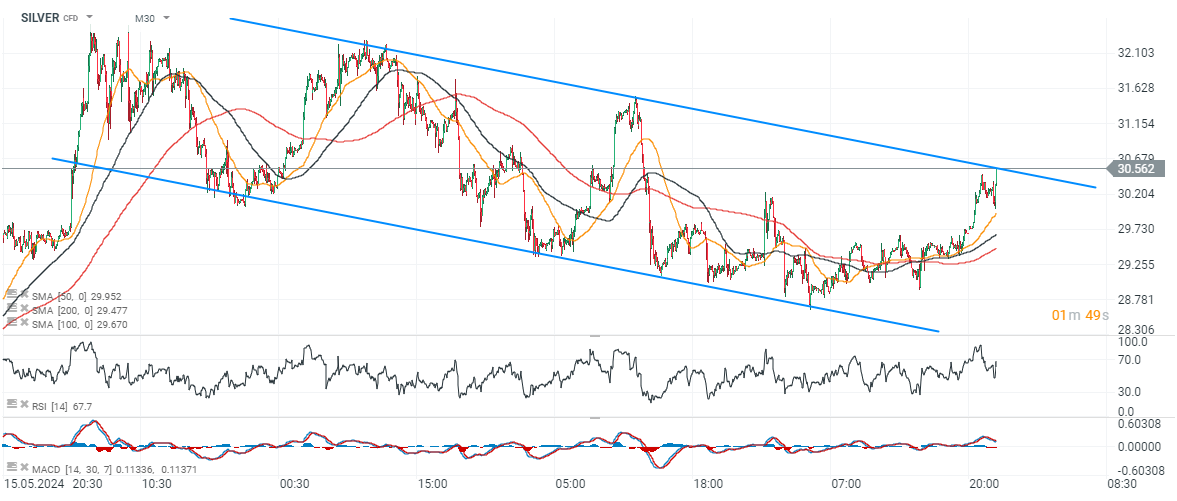 Stříbro dnes posílilo o 2,8 % a nyní je na nejvyšších úrovních od 14 dnů a vyšplhalo se nad zónu 30 USD.