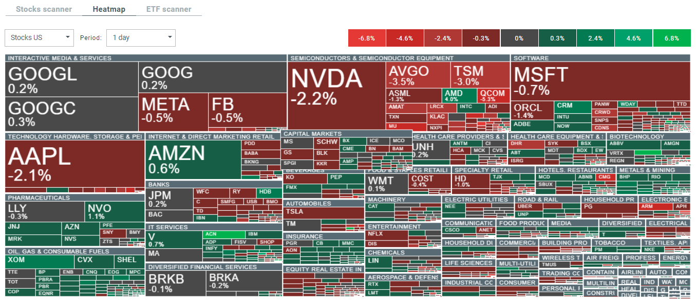 Indexy Wall Street dnes dostávají hit, přičemž výprodeje tlačí technologický sektor. Nasdaq-100 (US100) se za den snížil o 2 % a klesl na nejnižší úroveň za 2 týdny. Důvodem zhoršení nálady jsou zprávy v médiích, které říkají, že Spojené státy varovaly své spojence, že uplatňují nejpřísnější obchodní omezení na společnosti, které nadále poskytují Číně pokročilé polovodičové technologie. USA zvažují použití pravidla přímého zahraničního produktu, které jim umožňuje zavést kontroly na produkty, které obsahují americkou technologii. Tento krok bude primárně zaměřen na holandskou společnost ASML a japonský Tokyo Electron, které vyrábějí stroje používané při výrobě polovodičů. -