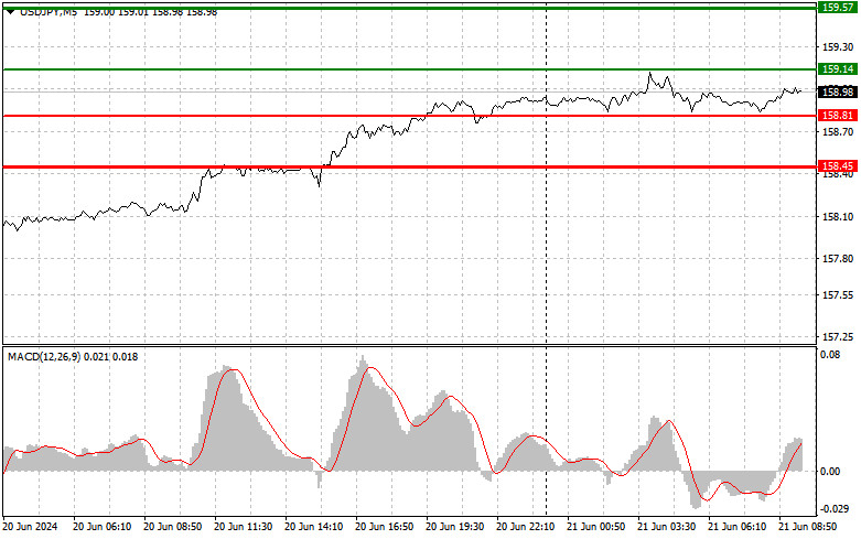 Scénář č. 2: Pár USD/JPY dnes plánuji prodávat i v případě dvou po sobě jdoucích testů ceny 159,14, když bude indikátor MACD v překoupené zóně. Toto omezí růstový potenciál páru a přinese obrat trhu směrem dolů. Lze očekávat pokles k opačným úrovním 158,81 a 158,45.