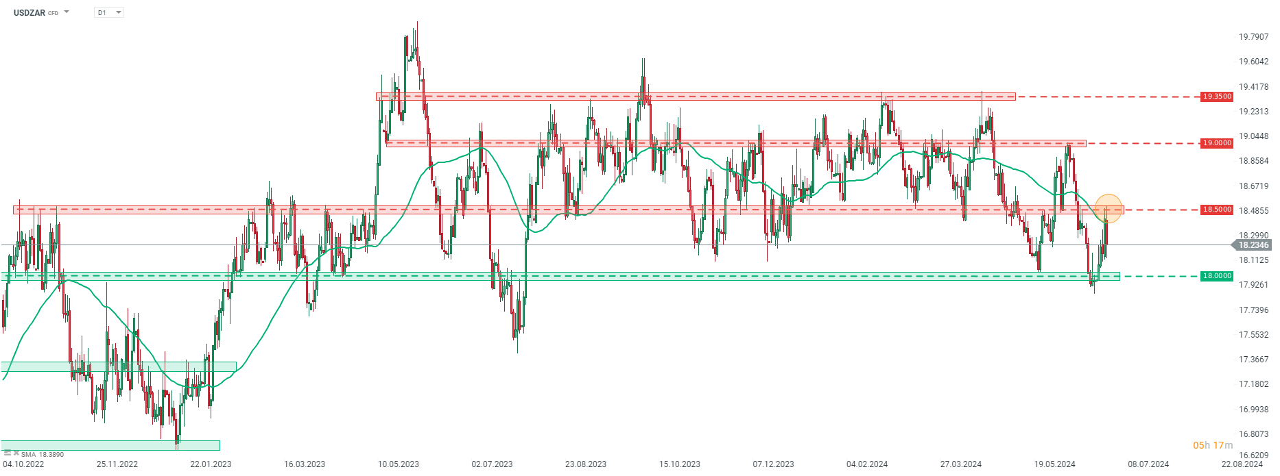 Podíváme-li se na graf USD/ZAR v intervalu D1, vidíme, že se pár včera a dnes pokusil prorazit nad zónu odporu 18,50, ale oba tyto pokusy selhaly a pár se stáhl zpět pod klouzavý průměr 50 seancí (zelená linie). Zóna krátkodobého supportu, kterou je třeba sledovat, se nachází v oblasti 18,00 a je vyznačena řadou předchozích cenových reakcí.