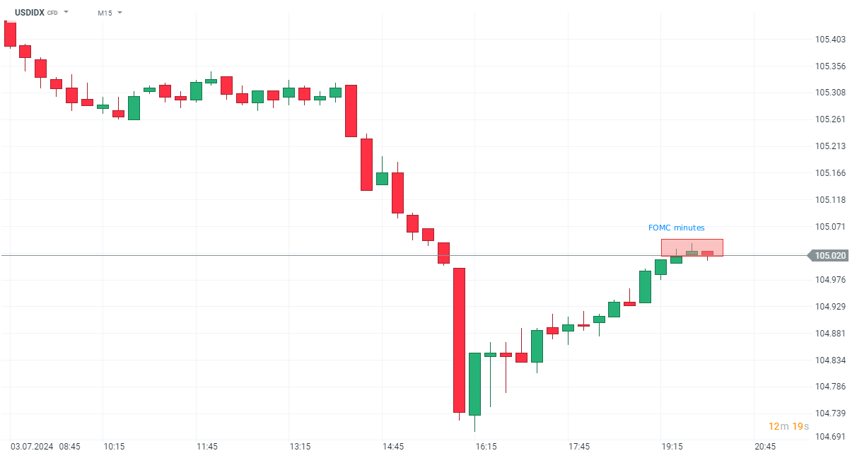 Na futures na americký dolar (USDIDX) můžeme pozorovat téměř absenci jakékoliv reakce na dnes zveřejněný zápis z FOMC.
