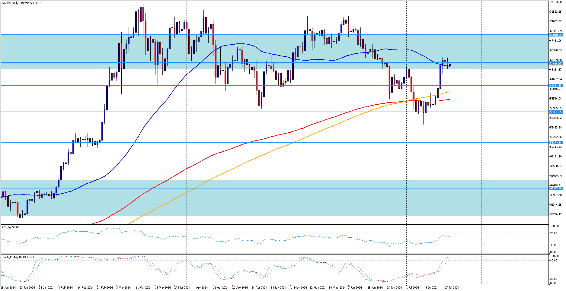 Bitcoin se v posledních několika seancích dostal pod výrazný nákupní tlak a překonal 50- i 200denní jednoduché klouzavé průměry (SMA). Ve středu cena vystřelila na čerstvé jednoměsíční maximum těsně nad hranicí 66 000, než některé zisky snížila. Pokud by Bitcoin dále rostl, mohli by býci zaútočit na dubnovou rezistenci 67 270 bodů. Ještě výše by se mohla ukázat oblast dvojitého vrcholu na úrovni 71 955 jako těžko překonatelná překážka. Překonání tohoto území by mohlo otevřít cestu k historickému maximu 73 800. Případně, pokud poslední rally oslabí, by cena mohla couvnout směrem ke květnovému supportu 60 150. Při sklouznutí pod toto dno by Bitcoin mohl napadnout dubnové dno na úrovni 56 483 bodů. Pokud by tato překážka selhala, mohl by se pokles zastavit na nedávném čtyřměsíčním dně 53 520. Bitcoin v posledních několika seancích předvádí působivý odraz a znovu získává 50- i 200denní SMA. Tento postup by však mohl čelit budoucím výzvám, jelikož krátkodobé oscilátory začínají poskytovat překoupené signály.