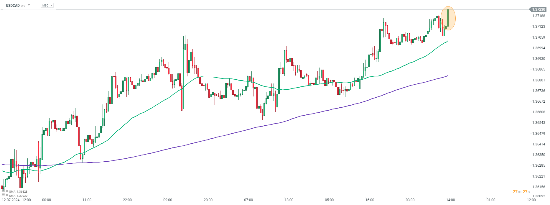 USDCAD vyskočil po neuspokojivém čtení kanadských maloobchodních tržeb za květen. Zdroj: xStation5