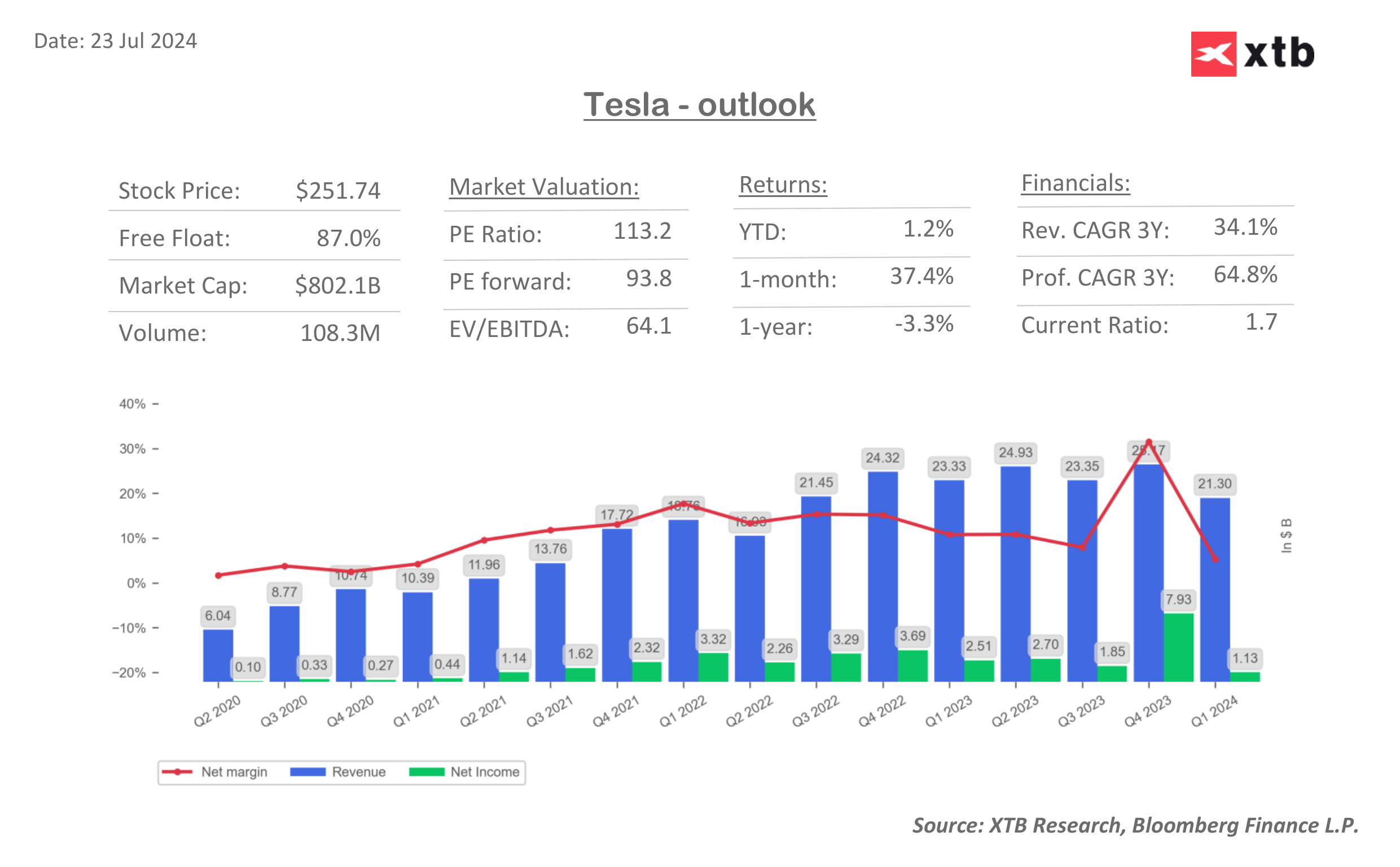 Dnes po skončení americké obchodní seance představí společnost Tesla (TSLA.US) výsledky za druhé čtvrtletí letošního roku. Vzhledem k tomu, že akcie společnosti za poslední měsíc vzrostly o téměř 40 % a v současné době se obchodují kolem 250 USD za akcii, můžeme vůči této zprávě vidět značný optimismus. Tesla je oceněna velmi vysokým 94násobným násobkem forwardových zisků (forward P/E) oproti nízkociferným hodnotám konkurentů na americkém automobilovém trhu v podobě Fordu, nebo General Motors. Ospravedlní zpráva tak výraznou prémii v ocenění?