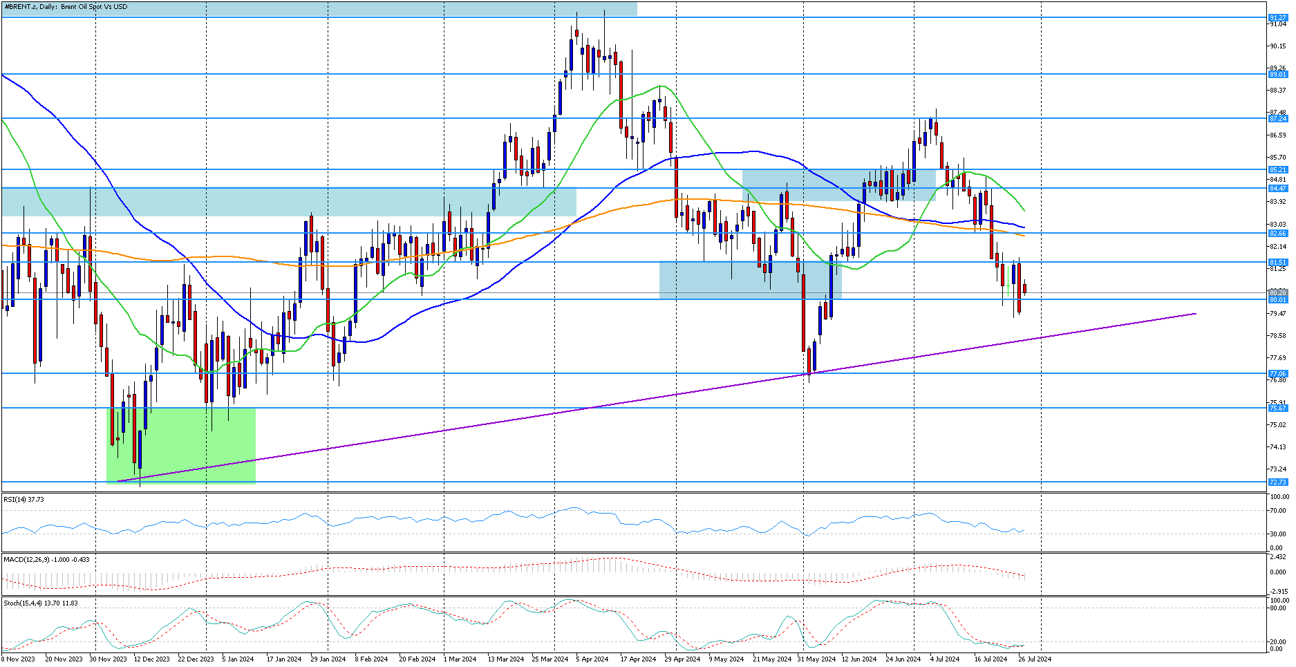 Futures kontrakty na ropu BRENT se po odražení od úrovně rezistence 87,24 pohybují v medvědím trendu. Od té doby se v denním časovém rámci propadl pod jednoduché klouzavé průměry (SMA) a trh v současnosti testuje hladinu podpory 80,00, než se ponoří k dlouhodobé vzestupné trendové linii poblíž 78,50. Úspěšné prolomení pod tuto oblast by mohlo otevřít dveře dalším ztrátám až k barikádě 77,06. Technické oscilátory potvrzují nedávný medvědí pohyb ceny. Index RSI míří na jih pod neutrální hranici 50, zatímco MACD rozšiřuje svou medvědí strukturu pod spouštěcí a nulovou linii. Případný vzestup nad 200denní a 50denní SMA by mohl obchodníkům umožnit dosáhnout úrovně odporu 82,50, než se zastaví u 20denního SMA na úrovni 83,64. Nad nimi čeká rezistence 84,47, která by mohla opět působit jako bod obratu. Ceny ropy z krátkodobého hlediska medvědí, nicméně z širšího pohledu jsou stále býčí, dokud stojí nad rostoucí trendovou linií.