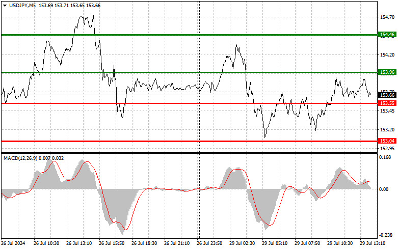 Scénář č. 2: Pár USD/JPY dnes plánuji prodávat i v případě dvou po sobě jdoucích testů ceny 153,96, když bude indikátor MACD v překoupené zóně. Toto omezí růstový potenciál páru a přinese obrat trhu směrem dolů. Očekávejte pokles k opačným úrovním 153,55 a 153,04.