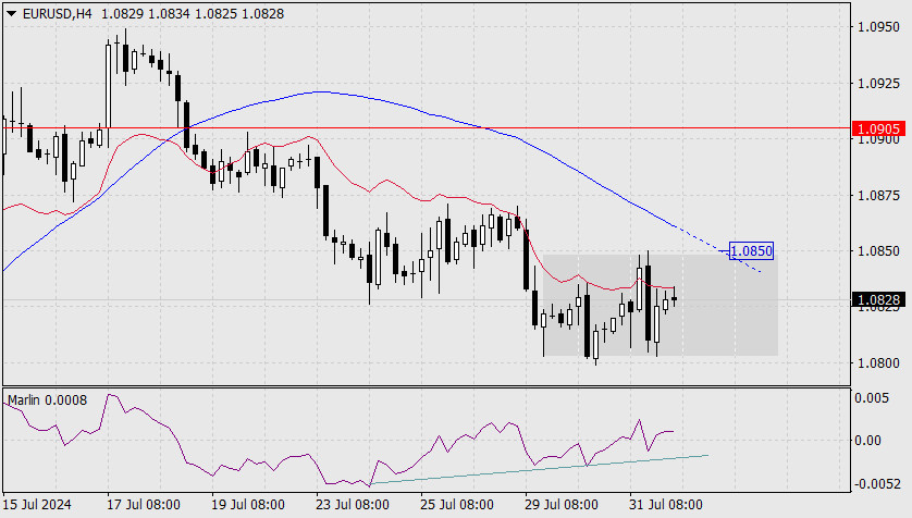 Ve 4hodinovém grafu se konvergence ceny s oscilátorem ukázala být účinná. Marlin již roste v kladném teritoriu a cena se pokouší vyšplhat nad linii rovnováhy. Nad linií rovnováhy se nachází rezistence linie MACD na úrovni 1,0850, která se shoduje se včerejším vrcholem. Efekt konvergence se zde může rozptýlit. V důsledku toho se bude cena pravděpodobně až do zítřejšího večera pohybovat do strany (šedý obdélník).