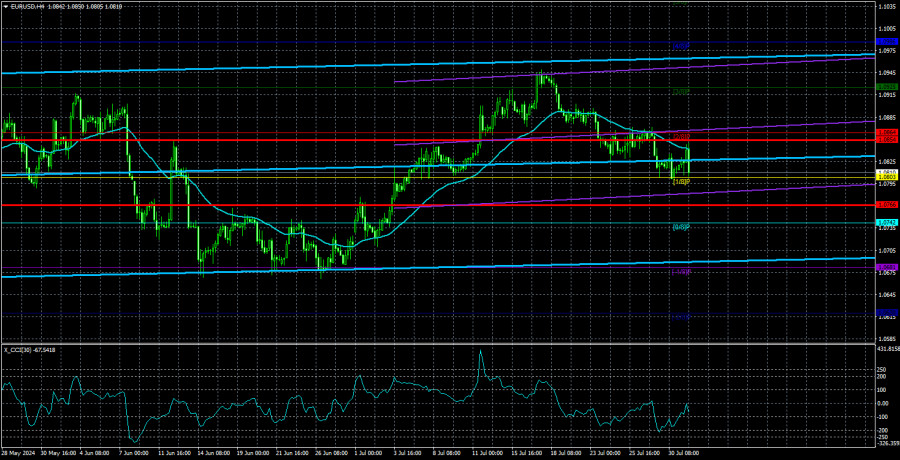EUR/USD nejprve provedl korekci k úrovni Murray "4/8" – 1,0742 a poté ke klouzavému průměru, přičemž od obou se odrazil. Pár tak může obnovit klesající pohyb a ten může pokračovat i v nadcházejících dnech. Cena zůstává pod linií klouzavého průměru a od eura očekáváme pouze další pokles. Všimněte si, že euro po dobu dvou měsíců vytrvale rostlo. Pohybovalo se směrem vzhůru, i když pozadí zpráv působilo v jeho neprospěch. Neustále jsme byli svědky toho, jak pár vytrvale vykazoval nelogické pohyby, které připomínaly práci tvůrců trhu proti retailovým obchodníkům. Bez ohledu na to nemůže zůstat bez povšimnutí skutečnost, že Evropská centrální banka v červnu zahájila cyklus uvolňování měnové politiky. Skutečnost, že Federální rezervní systém nezahájil cyklus snižování sazeb v březnu ani v červnu, rovněž hovoří za vše. Kombinaci těchto dvou faktorů považujeme za dostatečný důvod pro pokles eura na cenovou paritu. Opakovaně jsme to zmiňovali. -