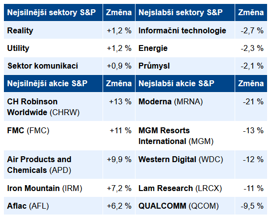 Sektorovým pohledem se docela dobře vede realitním společnostem a utilitám. Pod tíhou výsledků se nevede sektoru IT. Klesají i energetické společnosti a již zmíněný průmysl.