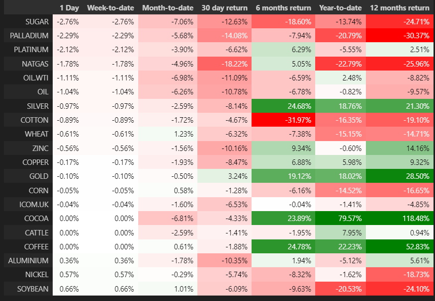 Velikost pohybů na akciovém trhu může poskytnout náhled na skutečné riziko recese. Na druhou stranu, když se podíváme na trh komodit, výrazné pohyby dnes nepozorujeme. Některé trhy, jako je ropa a průmyslové kovy, však již dlouho naznačovaly přetrvávající riziko recese, související především se situací v Číně. Mezitím je trh nyní znepokojen riziky recese v důsledku výrazného oslabení na americkém trhu práce a odvíjení obchodů financovaných jeny.