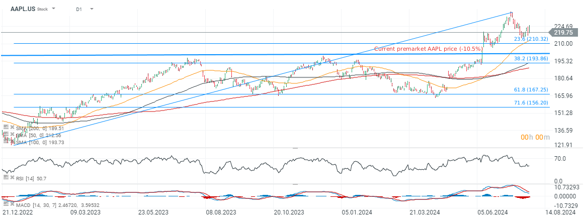 Katalyzátory nových produktů umělé inteligence a silné výsledky nestačily k udržení ocenění Applu, protože trh oceňuje vyšší šance na zpomalení americké ekonomiky. Investoři se nemohou dočkat změny pozice v následujících měsících, a přestože recese ještě není samozřejmou záležitostí, Wall Street se již stahuje z akcií, které by potenciálně mohly být zasaženy nejhůře při vyhlídce na slabší ekonomiku. První důležitá podpora pro Apple je kolem SMA200 (červená čára) a 38,2 Fibonacciho retracementu, téměř 190 USD za akcii.