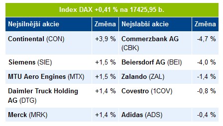 Na německé burze se dnes nejvíce propadl Mercedes-Benz, jež odepsal 3,4 %, následoval Airbus (- 2,8 %) a Bayer (- 2,7 %). Nejpozitivněji uzavřelo Covestro, jež připsalo 0,9 % poté co mu byla zvýšena cílová cena od UBS z 41 na 52 eur. Následované bylo Rheinmetalem (+ 0,8 %) a BMW (+ 0,7 %). Index DAX -1,28 % na 18236,19 b. -