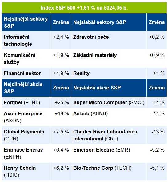 Index Dow Jones +1,1 % na 39425,01 b., S&P 500 +1,61 % na 5324,35 b., Nasdaq Composite +1,92 % na 16681,38 b.