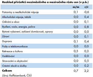 Ačkoli letní zdražování se očekávalo, v porovnání s předchozím měsícem, kdy ceny dokonce klesaly (-0,3 % m/m), jde o překvapivý nárůst. Vzhledem k sezónním vlivům došlo k výraznému zdražování zejména v kategorii rekreace a kultura, kde ceny jen mezi červnem a červencem vzrostly o více než 1/4. V meziročním vyjádření mírně zpomalila deflace u potravin, jejichž ceny poklesly o 3,1 % (vs -4,2 % v červnu), přičemž největší vliv na růst inflace měly opět ceny v oblasti bydlení, kdy nejvíce zdražovalo opět vodné a stočné. Ceny služeb meziročně rostou opět téměř 5% tempem.