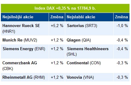 Společnost Hannover Rueck reportovala výsledky za 2Q 2024. Zisk EBIT vzrostl meziročně o 34 % na 847 mil. EUR a překonal tak očekávání analytiků 754,6 mil. EUR. Roční výhled společnost potvrdila. Za první pololetí Hannover Rueck vykázala čistý zisk 1,16 mld. EUR. Index DAX +0,35 % na 17784,9 b.