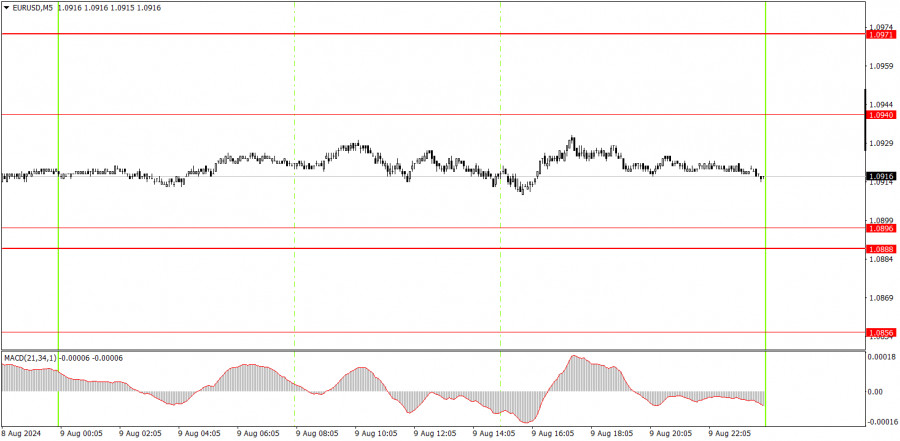 Měnový pár EUR/USD v pátek nejevil zájem o výrazný pohyb. Jak jsme se obávali, trh se po prudkém nárůstu volatility na konci minulého a začátku tohoto týdne rychle uklidnil a ukazatele volatility se vrátily na nízké hodnoty. V pátek jsme proto opět zaznamenali pohyby o pouhých 23 pipsů. Pátek nepřinesl nic zvláštního, co bychom mohli analyzovat. Dopoledne byl v Německu zveřejněn druhý odhad červencové inflace, který byl totožný s prvním a na pohyb páru neměl žádný vliv. Růst eura byl založen na přehnaných očekáváních trhu ohledně snížení sazeb ze strany Federálního rezervního systému, ke kterému ve skutečnosti nemusí dojít.