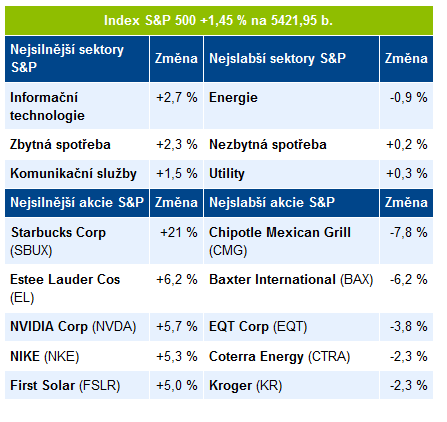 Živěji je i na korporátní úrovni. Čelo výkonnostních pelotonů dnes utvořila překvapivá personální rošáda, když za kormidlo chřadnoucího známého kavárenského řetězce Starbucks (SBUX +22 %) usedl Brian Niccol, dosavadní CEO úspěšného restauračního řetězce Chipotle Mexican Grill. Zde naopak zavládlo z této změny zklamání s poklesem akcií o téměř 8 %, řadící titul na chvost výkonnostní tabulky. Růstovou korekcí prochází kosmetická spol. Estée Lauder (EL +6,2 %) po předchozím poklesu na 7letá minima, daří se též korigovat předchozí ztráty přednímu výrobci grafických procesorů Nvidia (NVDA +5,7 %). Naopak větší ztráty registruje zdravotnická spol. Baxter International po oznámení o definitivním prodeji divize na léčbu onemocnění ledvin do rukou finanční skupiny Carlyle za 3,8 mld. USD, představující zklamání z dosažené částky, když ještě v červenci se spekulovalo o částce převyšující 4 mld. hranici.