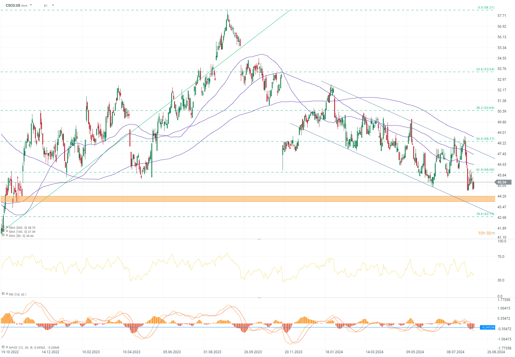 Technická analýza: Akcie společnosti Cisco se od začátku roku pohybují v klesajícím trendu. Je důležité poznamenat, že prolamuje postupné úrovně Fibonacciho retracementu. V současné době bude rezistencí 61,8% Fibonacciho retracement na úrovni 46,06 USD. Překonání této úrovně by mohlo vyvolat pokus o přiblížení se k hladině 50 SMA na úrovni 46,64 USD. V případě horších než očekávaných výsledků bude prvním testem kanál vyznačený na úrovni minim z října 2022. Jeho proražení by mohlo předznamenat otestování 78,6% Fibonacciho retracementu na úrovni 42,77 USD a proražení spodní části klesajícího kanálu. Index RSI se aktuálně nachází v neutrální zóně, tedy blízko překoupenosti. MACD se nachází v podobném mínusu jako na začátku roku. To může naznačovat překoupené podmínky a umožnit krátkodobý odraz.