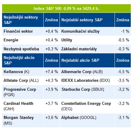 Index Dow Jones +0,11 % na 39810,98 b., S&P 500 -0,09 % na 5429,4 b., Nasdaq Composite -0,37 % na 17123,26 b.