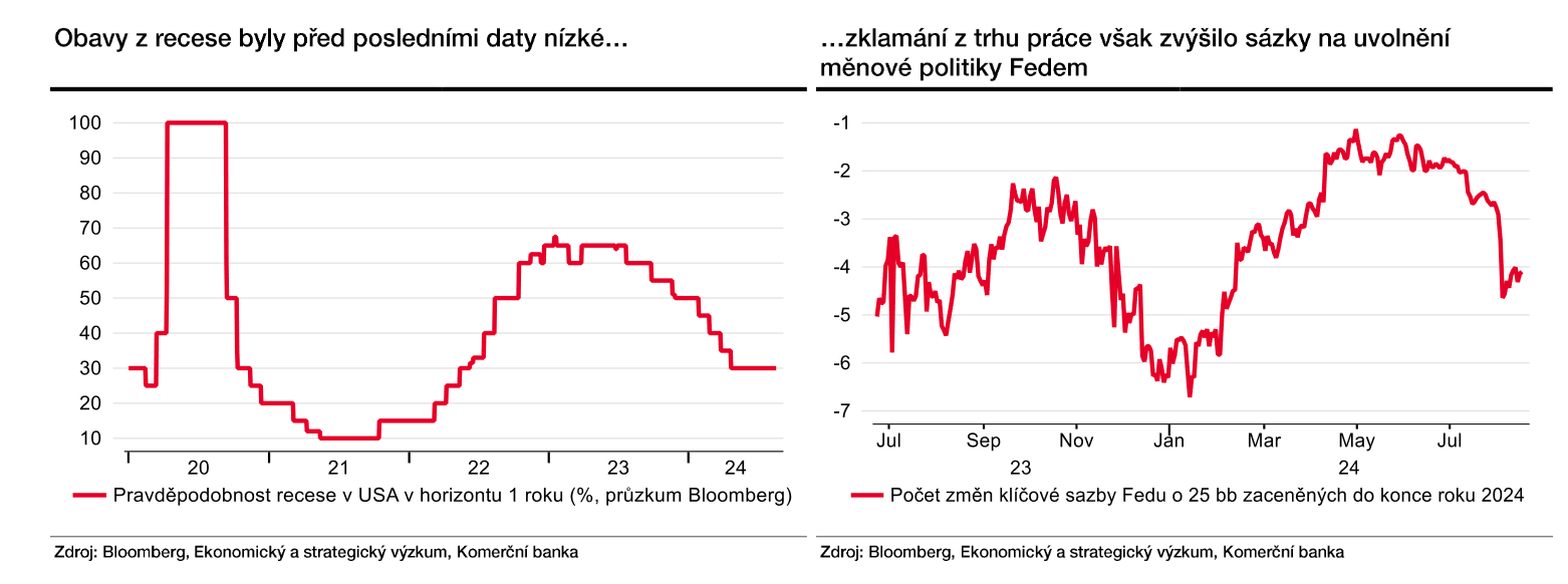 Před téměř dvěma týdny zveřejněná data z amerického trhu práce poměrně výrazně rozproudila jinak vesměs poklidné letní měsíce na finančních trzích. Ve Spojených státech bylo v červenci vytvořeno 114 tisíc nových pracovních míst, což bylo oproti očekávaným 175 tisícům viditelným zklamáním. Směrem dolů byl navíc revidován i předchozí měsíc a současně narostla míra nezaměstnanosti z červnových 4,1 na 4,3 procenta. Finanční trhy reagovaly výprodejem zejména zámořských akcií, dařilo se naopak dluhopisům. Svou roli zde pravděpodobně sehrálo i překvapivé zvýšení úrokových sazeb japonskou centrální bankou na konci července, které přispělo k redukci tzv. carry obchodů financovaných v japonském jenu a mířících mimo jiné právě do amerických akcií.