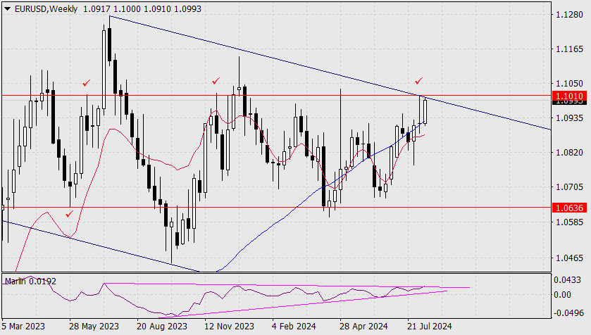V denním grafu se divergence proměnila v pravidelný pohyb oscilátoru Marlin směrem vzhůru, který má stále daleko k překoupeným podmínkám. Vytvoření dvojitého vrcholu je možné pouze v případě, že cena klesne z úrovně 1,1010.