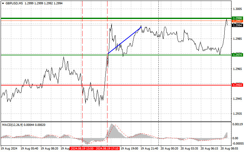 Test ceny 1,2954 proběhl, když indikátor MACD výrazně klesl od úrovně nula, což omezilo další možnost poklesu libry. Z tohoto důvodu jsem neprodával. Později, přibližně v polovině americké seance, byla otestována cena 1,2974, což odpovídalo začátku růstu MACD od úrovně nula, takže pokračoval uptrend. Pár ve výsledku urazil zhruba 20 pipů směrem nahoru, ale nedosáhl úrovně 1,2998. Opět nemáme k dispozici žádné významné údaje ze Spojeného království, takže libra by mohla klidně pokračovat v růstu vůči dolaru a udržet si uptrend. Osobně nevidím důvod k nákupům páru GBP/USD na současných maximech, takže je lepší jednat při korekcích. Co se týká intradenní strategie, budu spoléhat spíš na scénáře č. 1 a č. 2.