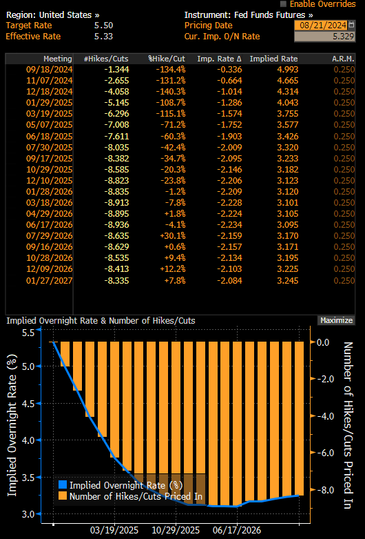 Trh stále odhaduje, že pravděpodobnost zvýšení sazeb o 50 bazických bodů v září je mírně nad 30 %, zatímco snížení o 25 bazických bodů je plně zohledněno. Do konce roku se očekává snížení sazeb o 100 bazických bodů. Zdroj: Bloomberg Finance LP