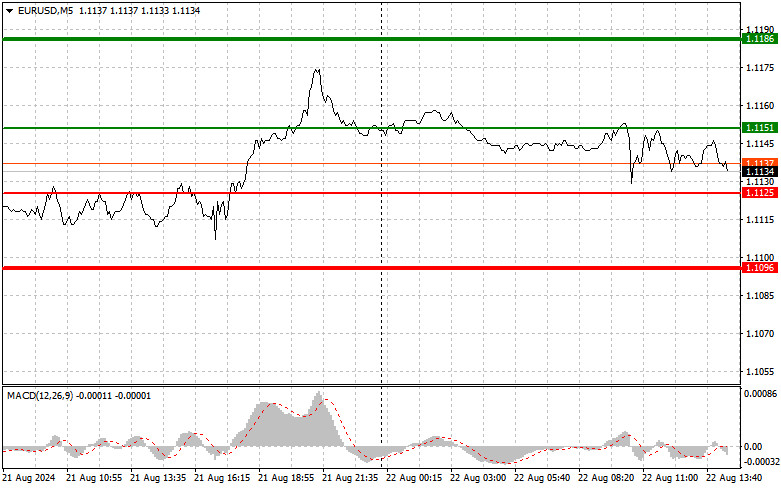 Scénář 1: Euro dnes plánuji nakupovat, pokud cena dosáhne zhruba úrovně 1,1151 (zelená linie v grafu) s cílem 1,1186, kde opustím trh a budu také euro prodávat s cílem pohybu o 30–35 bodů od vstupního bodu. Po slabých údajích z USA je dnes pravděpodobný silný růst eura, který bude pokračováním vzestupné korekce. Před nákupem se ujistěte, že indikátor MACD je nad úrovní nula a právě začíná stoupat.