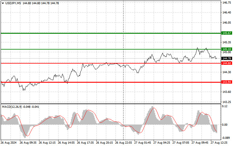 Scénář č. 1: Pár USD/JPY dnes plánuji nakupovat na vstupním bodě kolem úrovně 145,10 (zelená linie v grafu) s cílem růstu 145,67 (silnější zelená linie v grafu). Tam zavřu nákupní pozice a otevřu prodejní pozice v opačném směru, přičemž očekávám pohyb o 30–35 bodů od této úrovně. Pár dnes poroste nejspíš jen v případě velmi silných statistik z USA, což je ale nepravděpodobné. Důležité! Před nákupem se ujistěte, že indikátor MACD je nad úrovní nula a začíná stoupat.