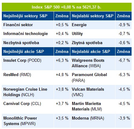 Sektorové zisky zatím vedou akcie finančních firem +0,5 %, následovány technologickým sektorem s nárůstem o 0,4 %. Na opačném konci se pohybuje energetický sektor s poklesem o 0,9%, následován utilitami s poklesem 0,7 %.