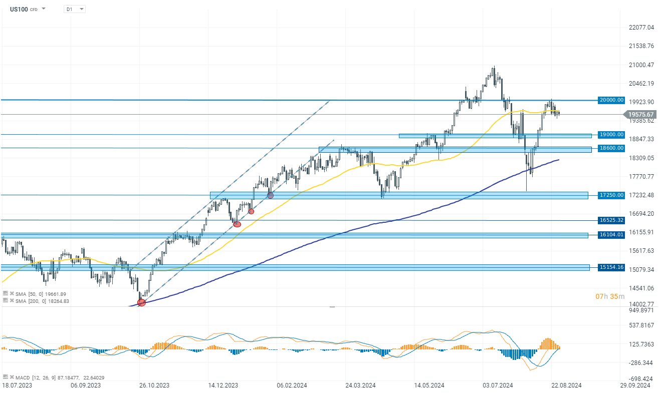 Technologický akciový index v době zveřejnění ztrácí 0,40 % a klesá na úroveň 19 550 bodů. Nejistotu investorů může podpořit nadcházející čtvrtletní zpráva od Nvidie, která byla v poslední době klíčovým motorem býčího trendu sektoru AI. Poklesy indexu následují po testu výrazné úrovně rezistence kolem 20 000 bodů. Poklesy tedy mohou pokračovat až do další zóny podpory kolem 19 000 bodů.