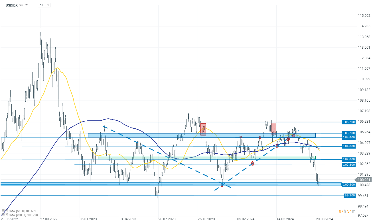 Pokles akcií je tažen silně rostoucím dolarem. Index USDIDX byl v poslední době pod výrazným tlakem směrem dolů kvůli blížícímu se prvnímu snížení úrokových sazeb v USA. Pokles dolaru měl pozitivní vliv na ocenění akcií. Po dosažení nejnižší úrovně za mnoho měsíců a testování spodního konce konsolidačního kanálu se však dolar dnes silně zotavuje a vrací se nad úroveň 101 000 bodů.
