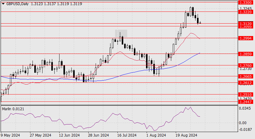 V pátek britská libra dosáhla cílového pásma 1,3095–1,3120. Dnes od této úrovně koriguje nahoru. Denní oscilátor Marlin se také zastavil – udělal si krátkou přestávku před dalším poklesem.