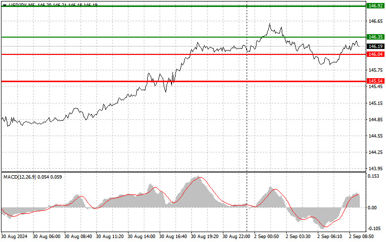 Scénář č. 1: Pár USD/JPY dnes plánuji nakupovat, až dosáhne zhruba úrovně 146,35 (zelená linie v grafu), s cílovou cenou 146,92 (silnější zelená linie v grafu). Kolem úrovně 146,92 plánuji opustit long pozice a vstoupit na short pozice (s cílem pohybu o 30–35 bodů od této úrovně). Další růst páru je dnes možný v rámci vzestupné korekce. Důležité: Před nákupem se ujistěte, že indikátor MACD je nad úrovní nula a začíná stoupat.