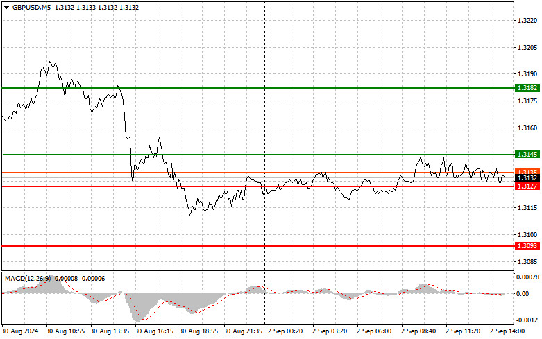 Scénář č. 1: Dnes plánuji koupit libru, pokud cena dosáhne přibližně 1,3145 (zelená čára v grafu), s cílem růstu na 1,3182 (tlustá zelená čára v grafu). Na úrovni kolem 1,3182 opustím dlouhé (long) pozice a začnu prodávat v opačném směru (očekávám pohyb o 30–35 bodů od vstupní úrovně). Silný pohyb libry směrem vzhůru je dnes nepravděpodobný. Důležité! Před nákupem se ujistěte, že se ukazatel MACD nachází nad nulou a právě od ní začíná stoupat.