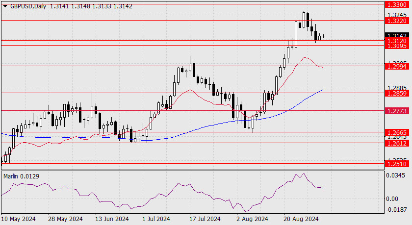 Cena se v grafu 4H konsoliduje nad pásmem 1,3095–1,3120, předtím se 30. srpna usadila pod liniemi indikátorů rovnováhy a MACD. Oscilátor Marlin roste, takže konsolidace ještě neskončila.